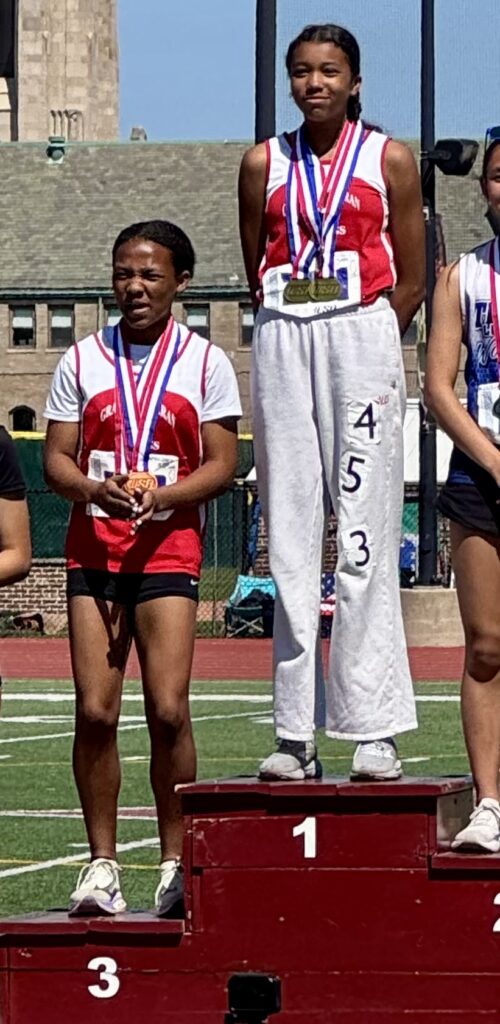 - The Girls 4×100 Relay Team—Maya Bourelly, Aryelis Cabral, Shelby Beals, and Esme Davis—took 1st place and set a new school record of 53.56 seconds! An incredible accomplishment!